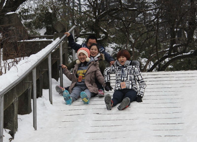 觀光車,行自半山腰,已經可以看到還沒有化掉的積雪,雪白雪白的,一小堆一小堆的,已經讓所有人都興奮了,真想馬上到達山頂,滑雪、堆雪人、打雪仗、看猴子.......