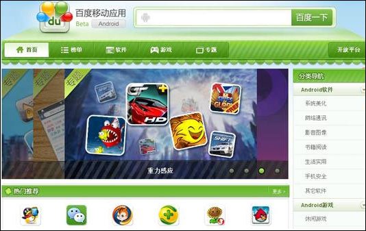 騰訊科技訊(樂(lè)天)11月10日消息,繼手機(jī)Wap端后,百度Web端安卓移動(dòng)應(yīng)用搜索服務(wù)已于近日正式上線(as.baidu.com)。PC版百度移動(dòng)應(yīng)用搜索與機(jī)鋒網(wǎng)、應(yīng)用匯、安卓、3G門戶、當(dāng)樂(lè)等眾多國(guó)內(nèi)主流游戲、軟件應(yīng)用廠商達(dá)成合作,涵蓋了超過(guò)10萬(wàn)個(gè)正版應(yīng)用。