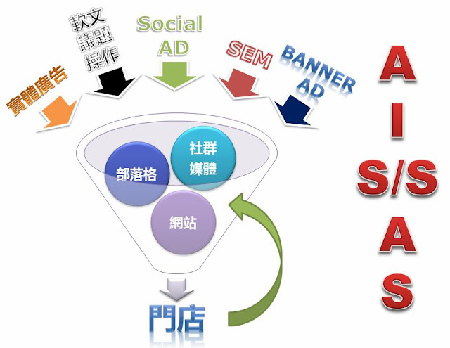 注1:原本的策略是AISAS,但是在社群的年代里面,加上近年來(lái)垃圾及業(yè)配信息太多,人們又逐漸懶得自行過(guò)濾信息,也因此Social(社會(huì)化)有逐漸侵蝕Search(搜尋)的比例之勢(shì),所以在既有的AISAS策略上多加了一個(gè)”S”。