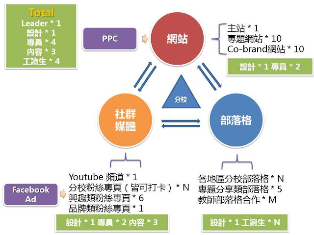 在整體系統(tǒng)的營(yíng)銷(xiāo)設(shè)計(jì)理念,我們還是采取”內(nèi)容為王“作為主要的出發(fā)點(diǎn),在負(fù)責(zé)生成內(nèi)容的人力配置上我們就安排了三個(gè)。另外分校博客負(fù)責(zé)產(chǎn)生內(nèi)容的,則是由對(duì)網(wǎng)絡(luò)有濃厚興趣的工讀生,以比較輕松的方式撰寫(xiě),只需要分校的主管審過(guò)即可,其他幾個(gè)平臺(tái)則安插專(zhuān)員進(jìn)行例行維護(hù)及互動(dòng),這樣的配置也是考慮各平臺(tái)屬性的不同及整體人力成本考慮而進(jìn)行的配置。由于社會(huì)化媒體是一個(gè)很重內(nèi)容的平臺(tái),因此所有的內(nèi)容的出發(fā)由社會(huì)化媒體作為第一站,專(zhuān)員再利用其內(nèi)容作二次營(yíng)銷(xiāo),但博客是屬于比較輕松性的平臺(tái),所以并不需要太專(zhuān)業(yè)的人力,只需基礎(chǔ)的文案撰寫(xiě)能力就好(不過(guò)這中間依據(jù)企業(yè)的需求,還是有經(jīng)過(guò)培訓(xùn)的)。