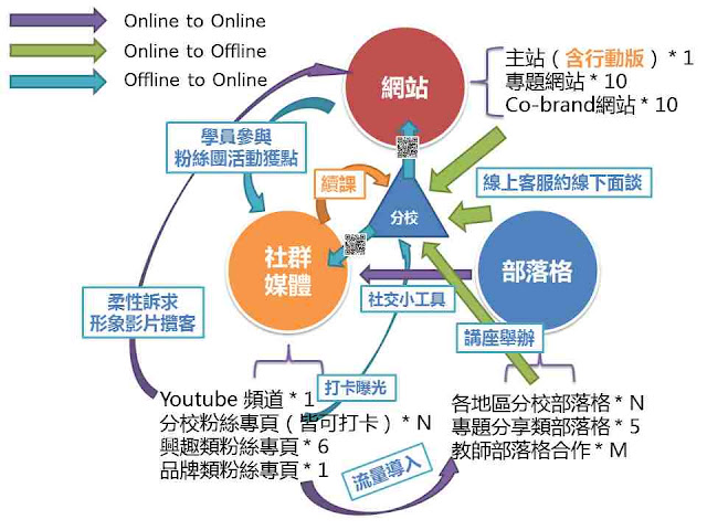 其實(shí)這張圖已經(jīng)闡述了整個(gè)人流跟資訊流的走向,先前我們已經(jīng)講過(guò)我們整個(gè)內(nèi)容為王策略的出發(fā)點(diǎn)在社會(huì)化媒體上,透過(guò)社會(huì)化媒體的擴(kuò)散及導(dǎo)流,可以將線上的人流用實(shí)體免費(fèi)活動(dòng)的方式,導(dǎo)引至線下分校去進(jìn)行收割;若當(dāng)下沒(méi)有收割,我們只激發(fā)了他的注意及興趣后,潛在用戶也可以透過(guò)搜索或是社會(huì)化媒體上,獲取我們更多的資訊,最終還是可以透過(guò)線上客服約訪的方式,在約到線下來(lái)成交。