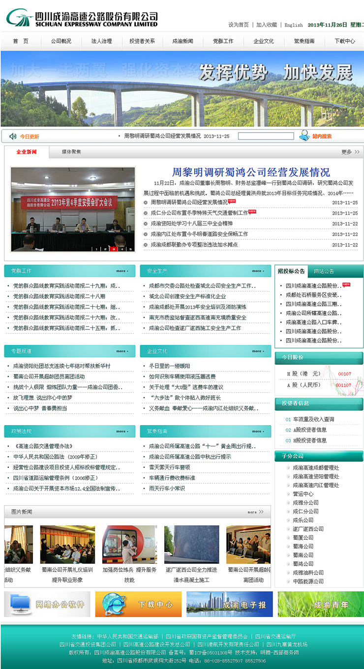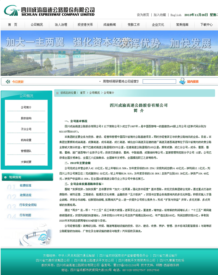 客戶概況:四川成渝高速公路股份有限公司(以下簡稱公司)成立于1997年,是中國西部唯一的基建類A+H股上市公司(證券代碼分別為601107和00107)。本集團(tuán)的主要業(yè)務(wù)為投資、建設(shè)、經(jīng)營和管理中國四川省境內(nèi)公路基建項(xiàng)目,同時(shí)亦經(jīng)營其它與收費(fèi)公路相關(guān)的業(yè)務(wù)。目前,本集團(tuán)主要擁有成渝高速、成雅高速、成樂高速、成仁高速、城北出口高速及在建的遂廣高速及遂西高速等位于四川省境內(nèi)的收費(fèi)公路全部或大部分權(quán)益,轄下已建成高速公路里程約575公里,在建高速公路里程約165公里。