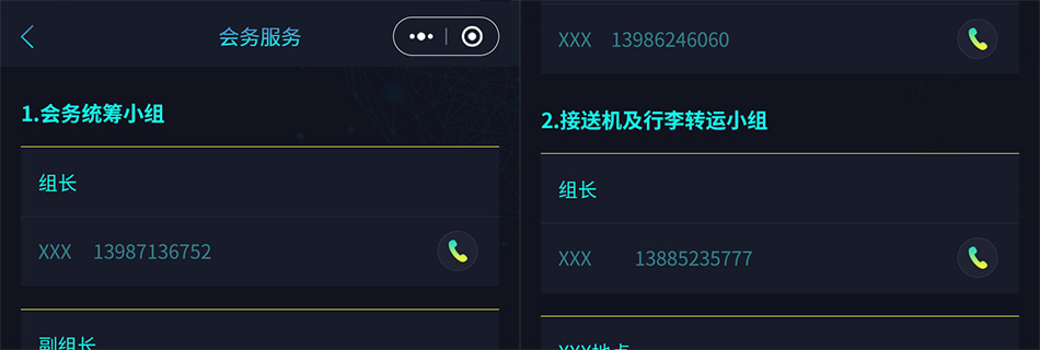 展示本次會議現(xiàn)場服務小組的詳細名單、聯(lián)系電話等;電話可以設置一鍵撥號;